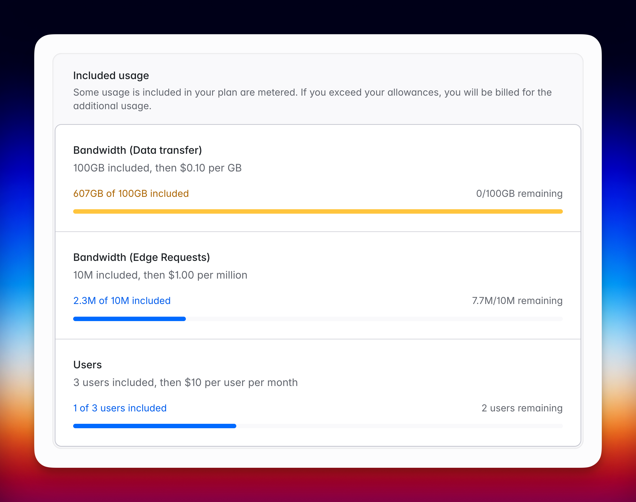 In this case, I am seeing higher Bandwidth Data Transfer than I expected. This helped me to realize that I am using usePoll() in my Inertia app in too many places. Lots of bandwidth from those HTTP requests in the polling. I will adjust my app to use less data.