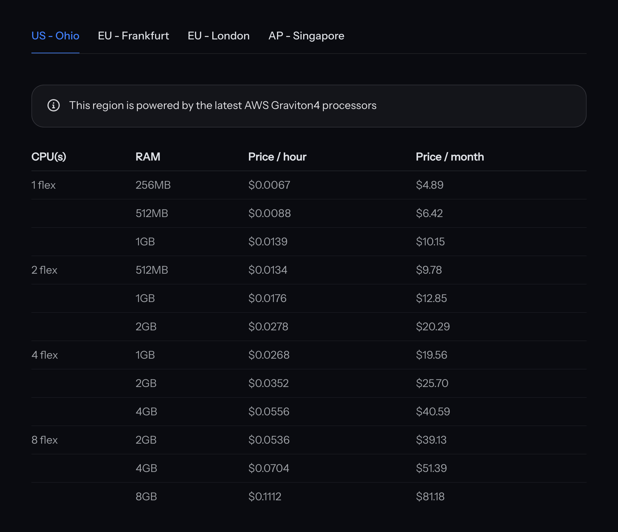If you want to see a full list of pricing, you can visit our Docs Pricing Page to see pricing for all the plans, app compute, and resource options.