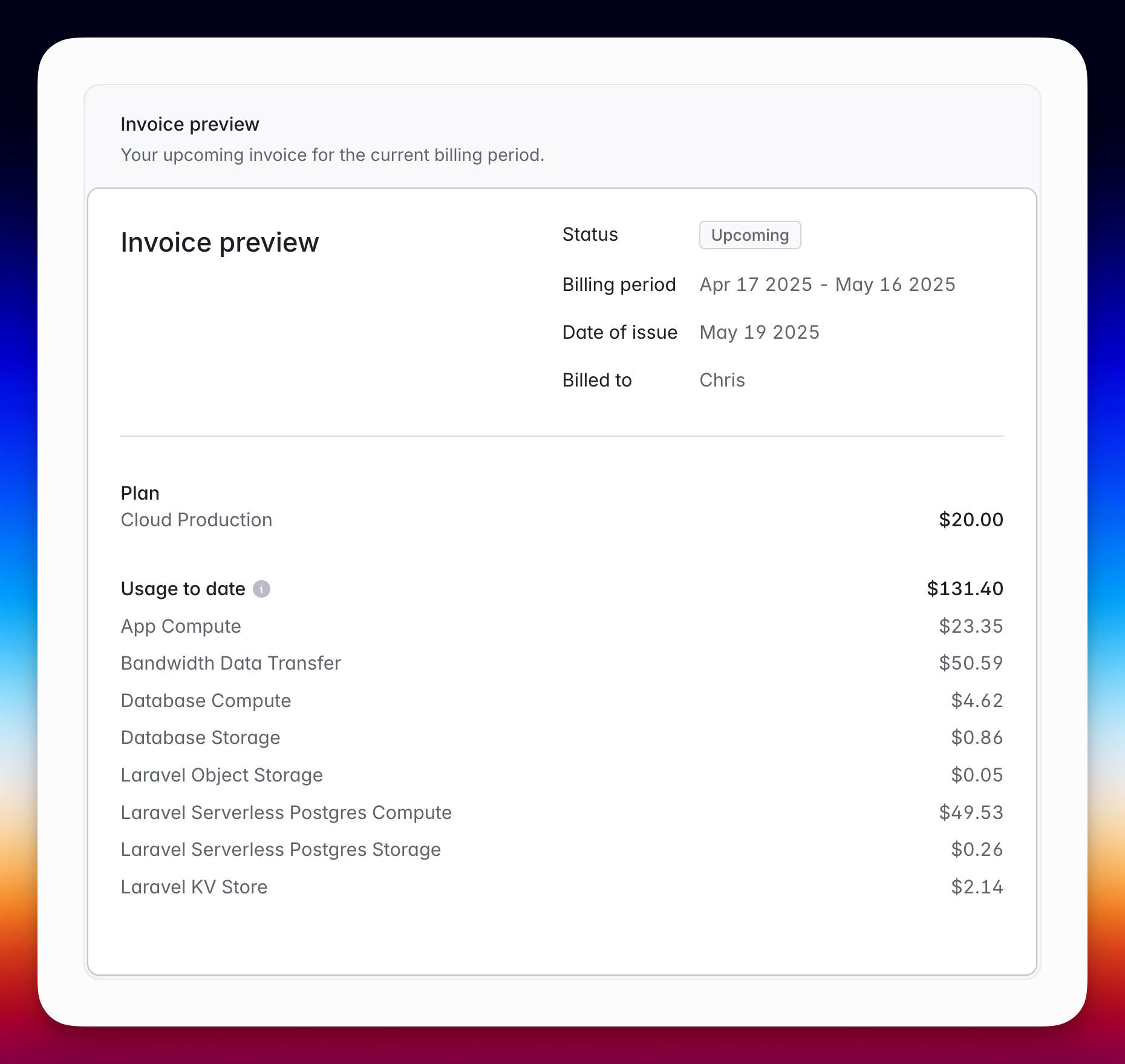We also have Invoice preview in your Laravel Cloud dashboard. At any time in the month, you can see how much usage you have accumulated so you can adjust your resource settings for the rest of the month.