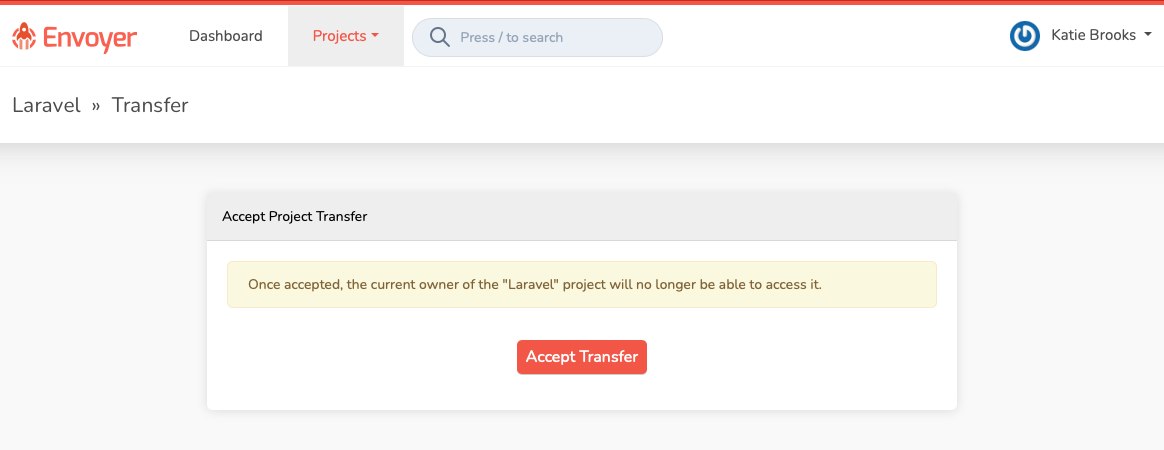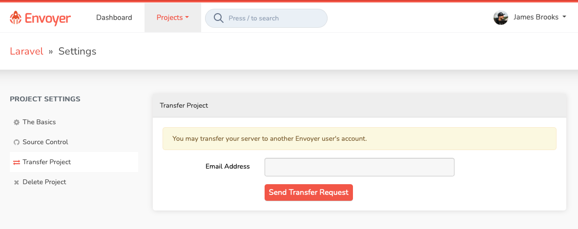 Projects may only be transferred to existing Envoyer accounts. Recipients will need an active subscription and be connected to the same source control provider as the project to be transferred.