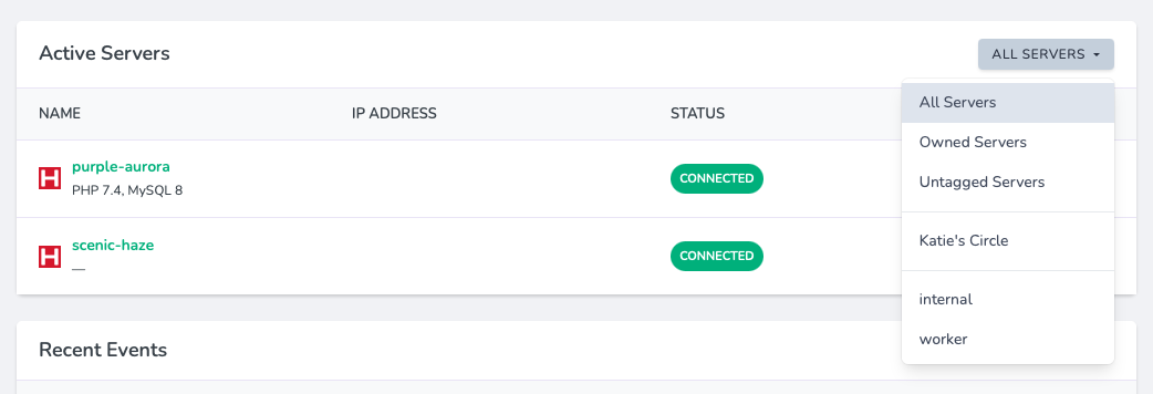 Another way to filter servers by tags is within the Active Servers list on your Forge dashboard. Clicking the All Servers button opens up a dropdown menu that provides a few different ways to filter your servers, including tags: