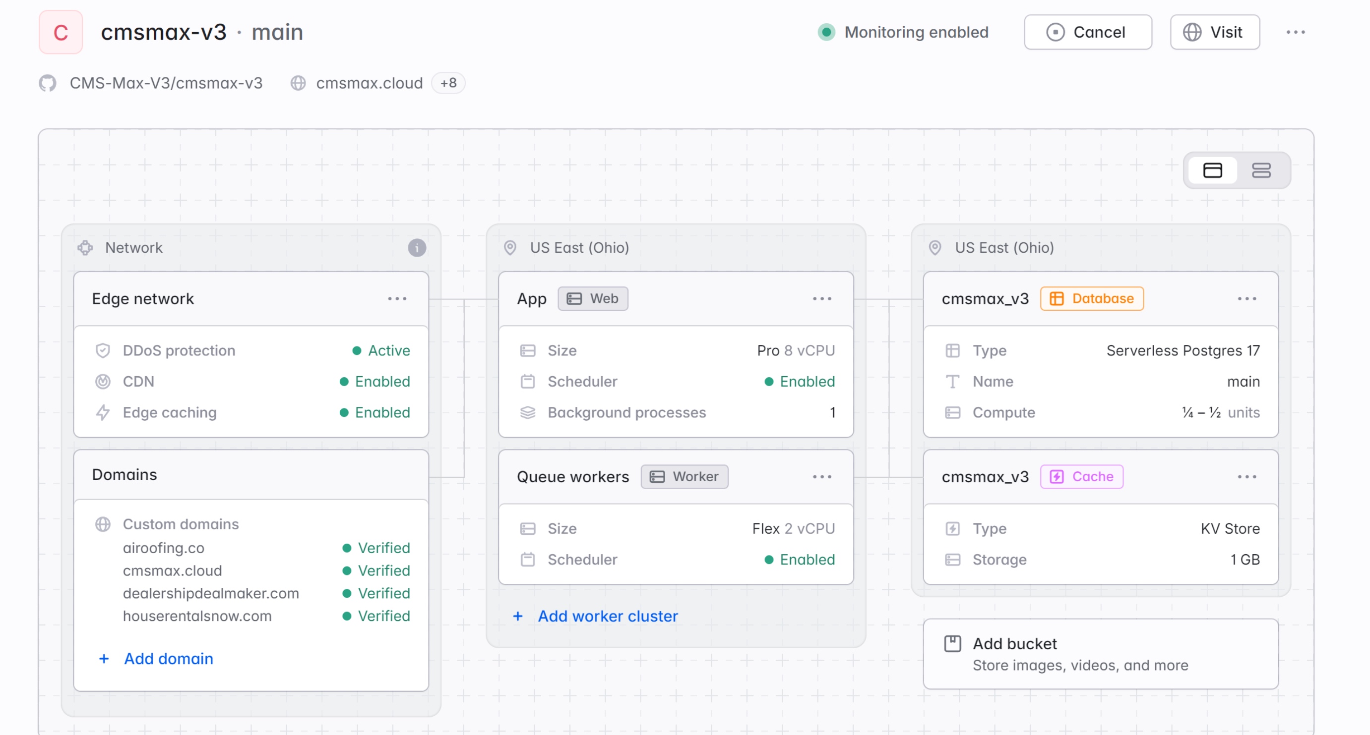 Zero-downtime deployments and instant provisioning let CMS Max push updates across hundreds of sites without manual intervention. Built-in scaling eliminates the need for traffic prediction or hardware provisioning. Laravel Cloud's security stack includes DDoS protection, SOC 2 readiness, and automated SSL, which is essential for CMS Max's work with government and financial organizations.