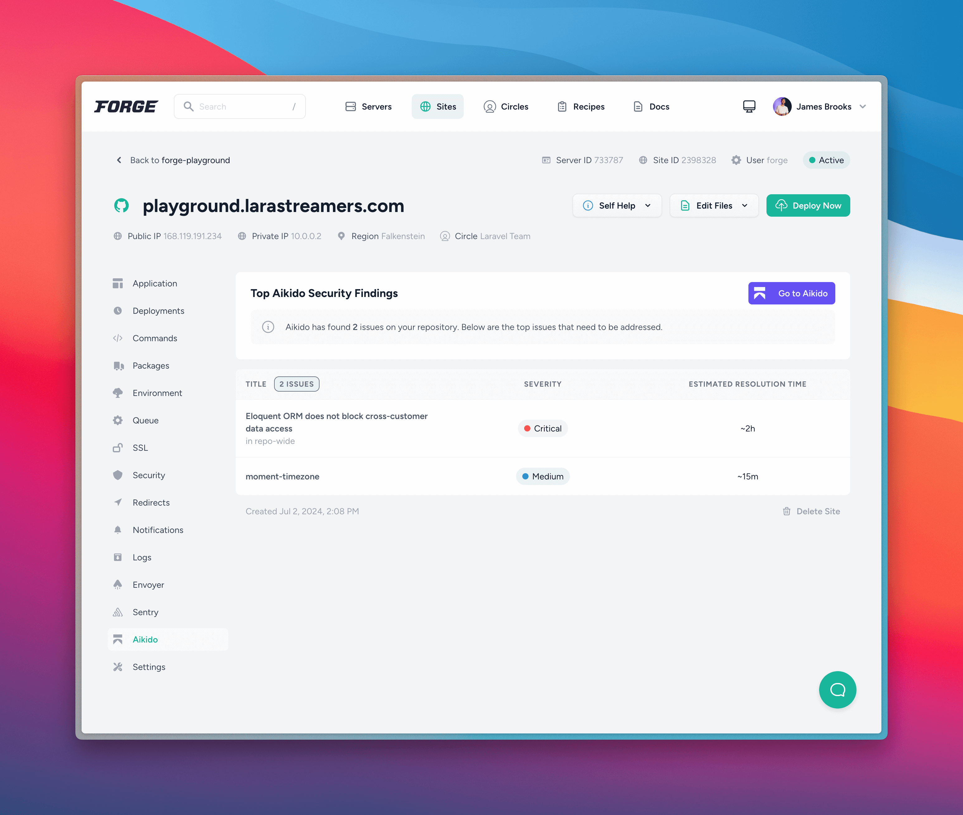 We’ve made adding Aikido’s security scanning to your Laravel application as simple as possible, by allowing you to connect your application to Aikido within Forge. By adding Aikido to your application through Forge, you enable Aikido to fetch and display security issues. Developers will see results in Forge in <1 minute, can set real alerts, and have a step by step guide to fixing any issues. You can add Aikido by following these steps in Forge: