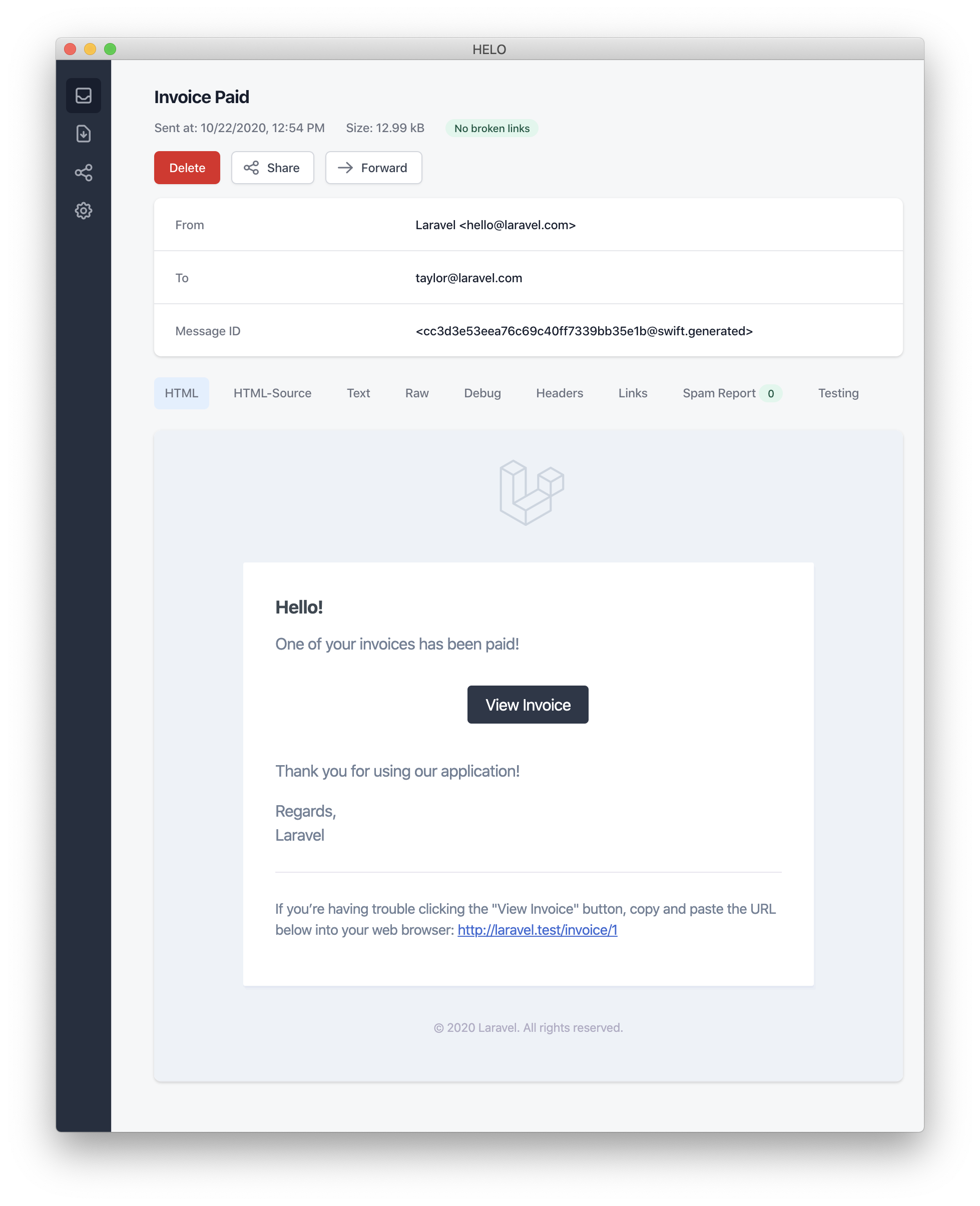 In this example, we register a greeting, a line of text, a call to action, and then another line of text. These methods provided by the MailMessage object make it simple and fast to format small transactional emails. The mail channel will then translate the message components into a beautiful, responsive HTML email template with a plain-text counterpart. Here is an example of an email generated by the mail channel: