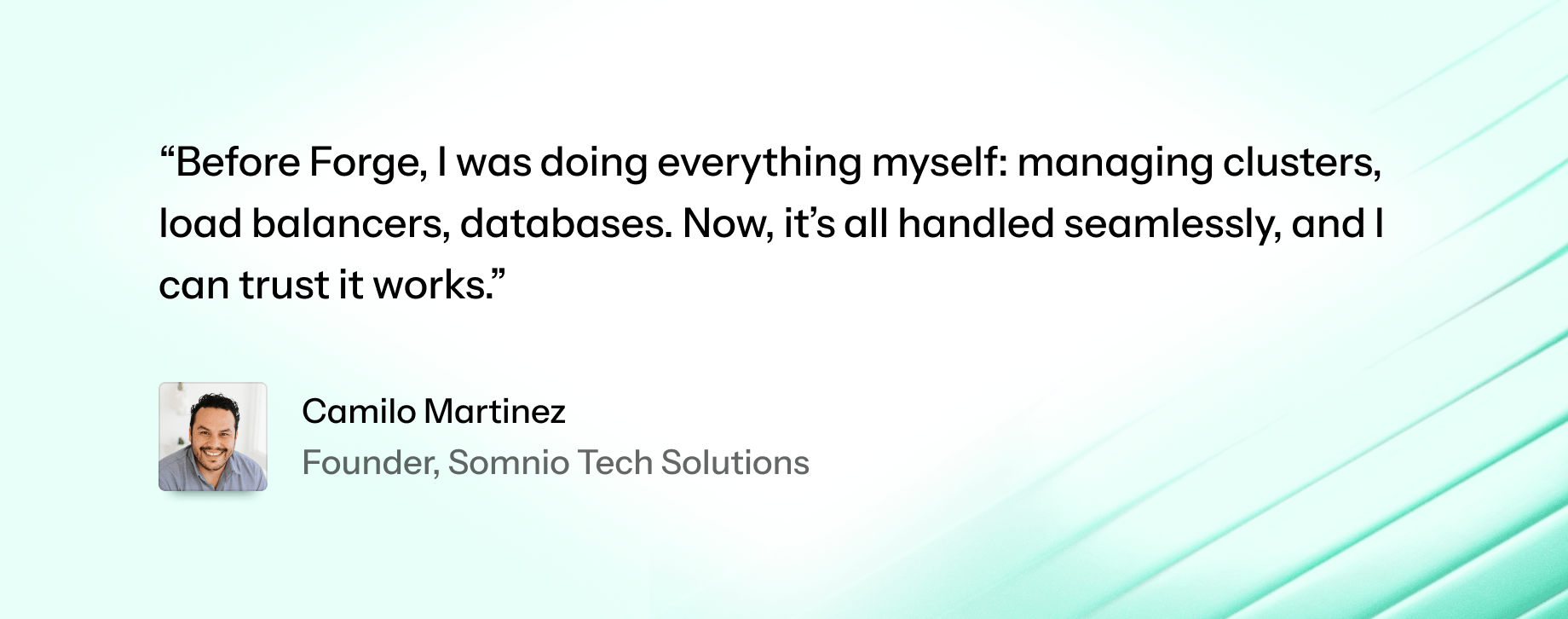 “Before Forge, I was doing everything myself: managing clusters, load balancers, databases. Now, it’s all handled seamlessly, and I can trust it works,” Camilo said.