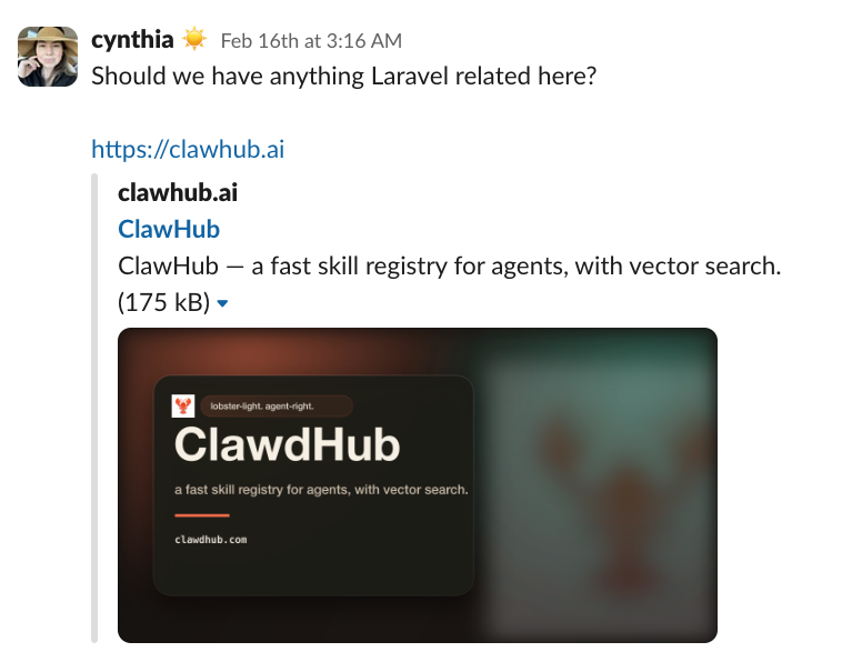 A few hours later, the Laravel Cloud skill was ready and running on ClawHub, a fast registry for agent skills that acts like OpenClaw’s marketplace.